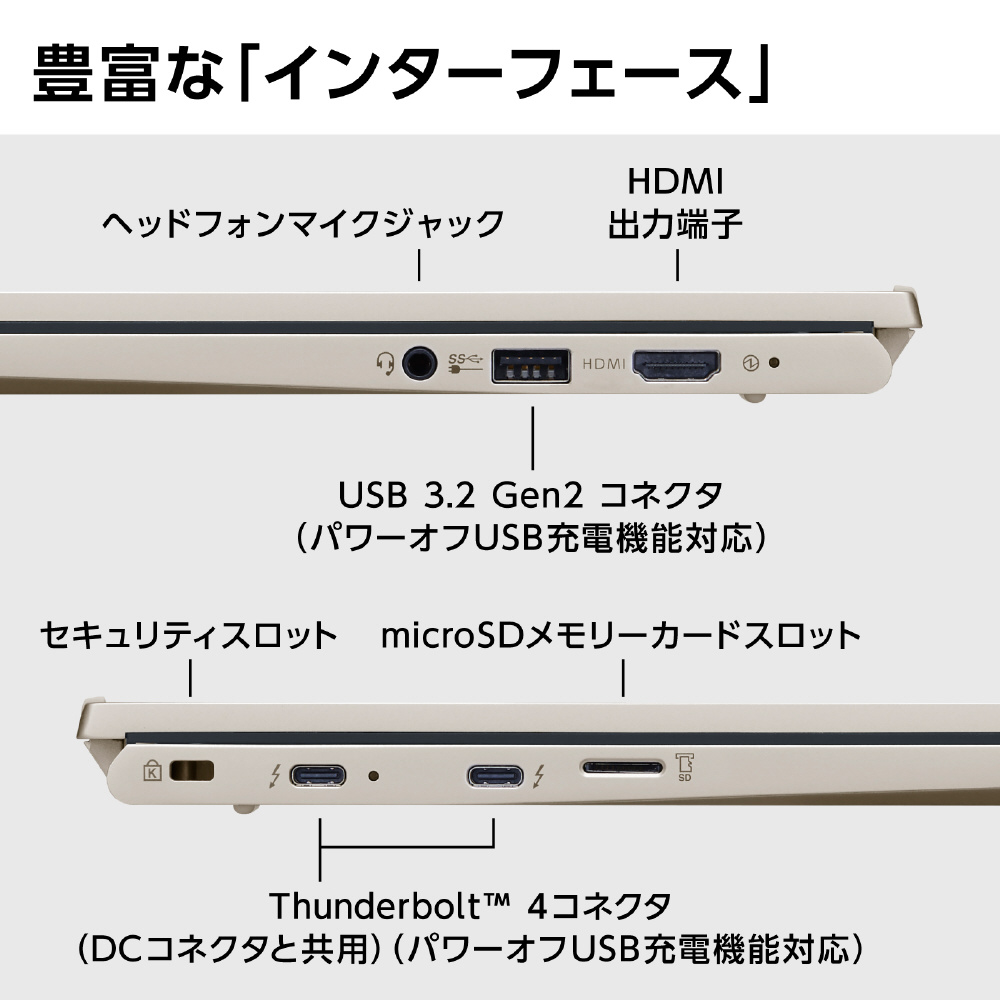 | インターフェイス | ・USB-C(Thunderbolt 4(USB4 Gen3×2))×2(USB Power Delivery 3.0対応(パワーオフUSB充電機能付)、ACアダプタの接続ポートを兼用、DisplayPort出力機能付) ・USB-A(USB3.2 Gen2)×1(パワーオフUSB充電機能付) ・HDMI出力端子×1 ・ヘッドフォンマイクジャック(3.5mm 4極ミニジャック)×1(共用:マイク入力・ヘッドフォン出力・ライン出力) ・メモリーカードスロット:microSD(microSDHC/microSDXC)×1 |