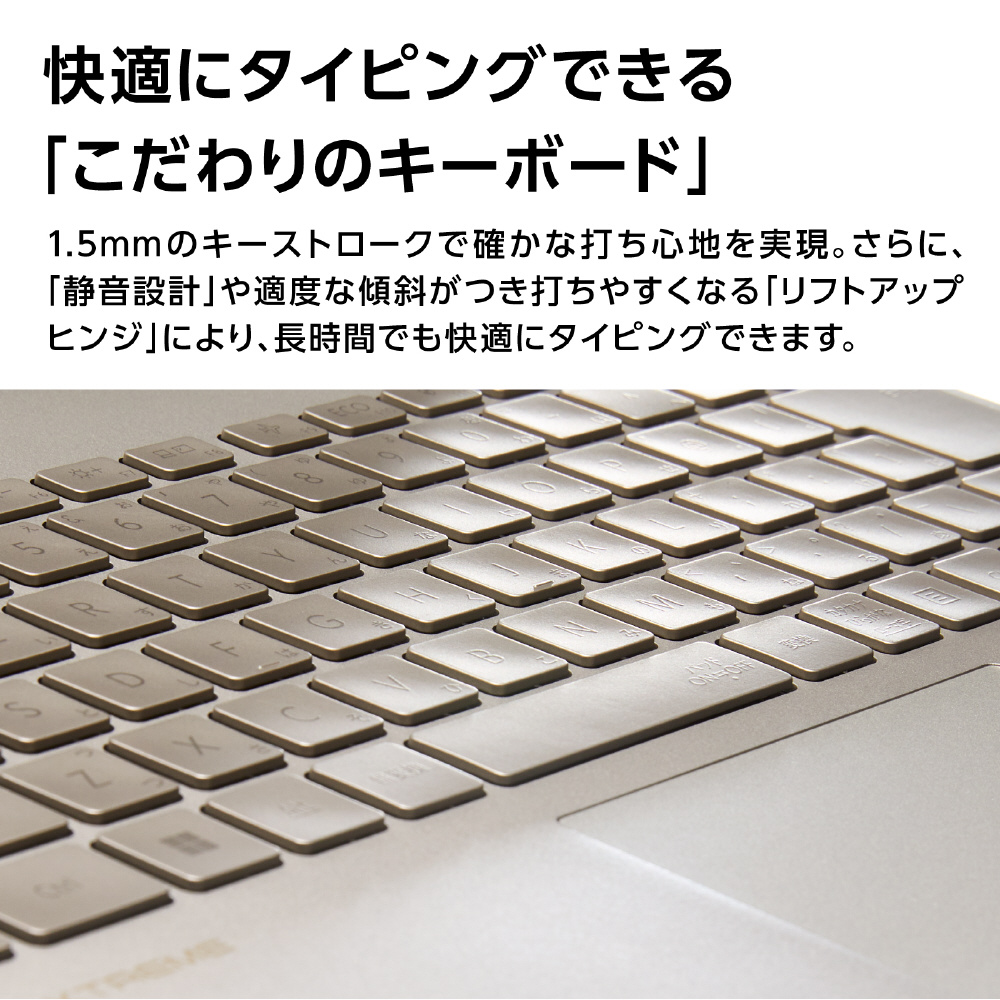 さらに、「静音設計」や適度な傾斜がつき打ちやすくなる「リフトアップヒンジ」により、長時間でも快適にタイピングできます。