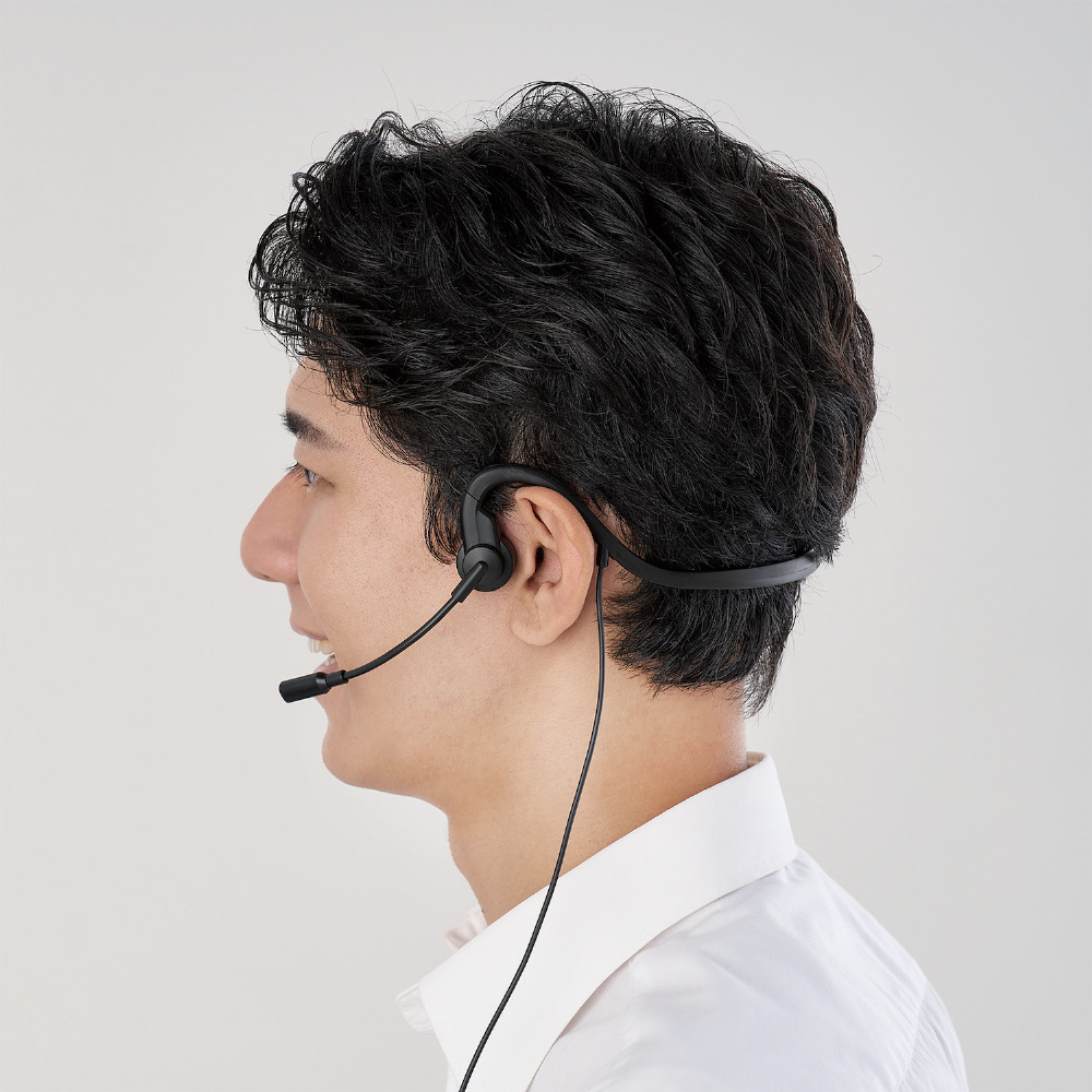 長時間のWeb会議やビデオ通話でも耳が痛くなりにくい、オープンイヤータイプの骨伝導有線ヘッドセットです。耳を塞がないため開放感があり、快適な装着感を保ちます。ペアリング・充電いらずの有線タイプで、パソコンやタブレットに挿してすぐに使用できます。