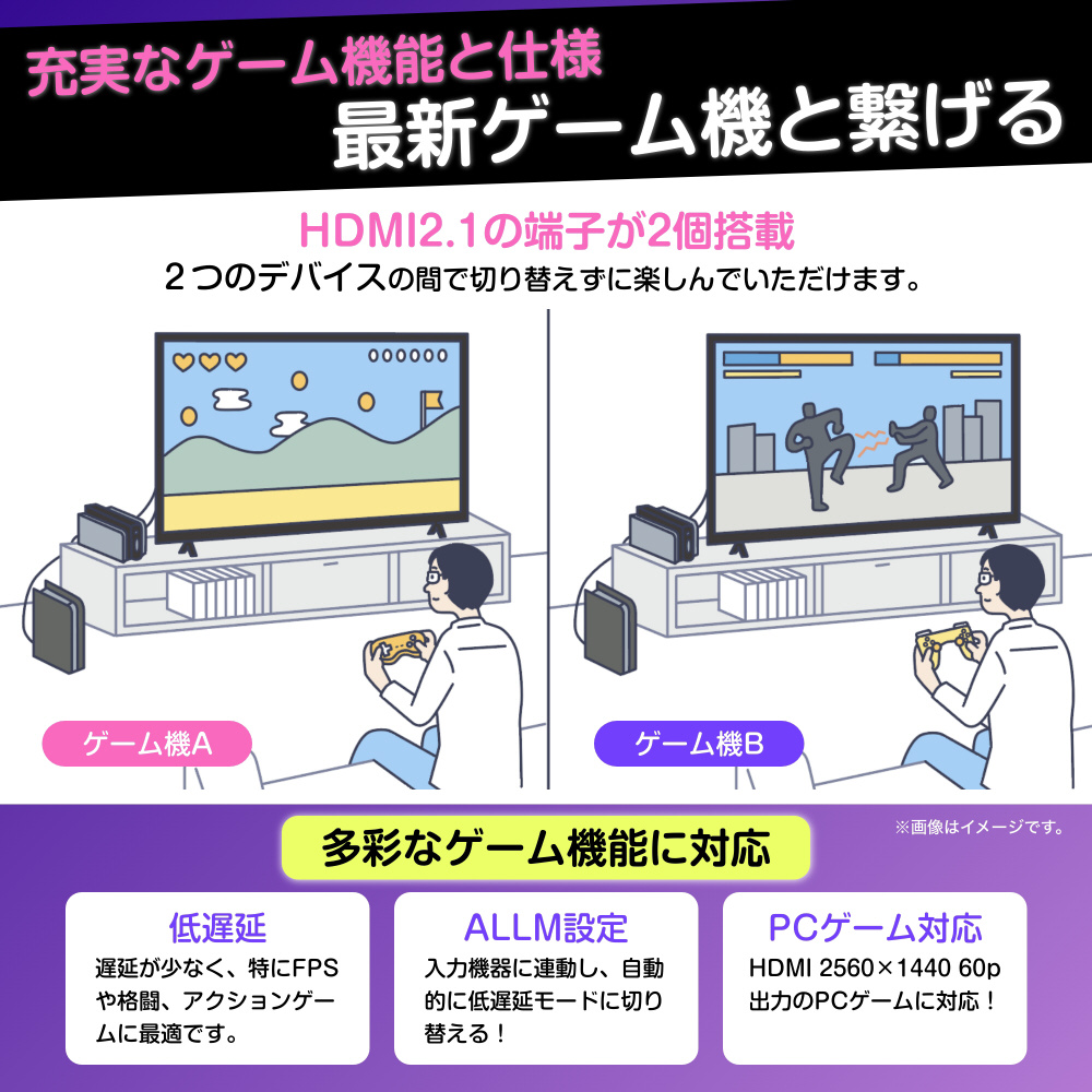 HDMI2.1規格入力に対応。最新ゲーム機も快適にプレイできます。対応端子が2つあるのでケーブルを差し替えずに楽しんでいただけます。