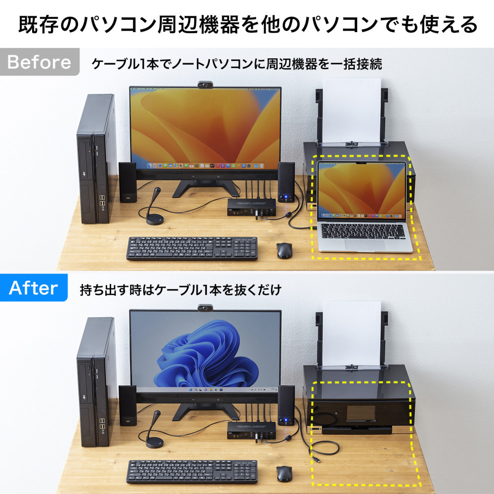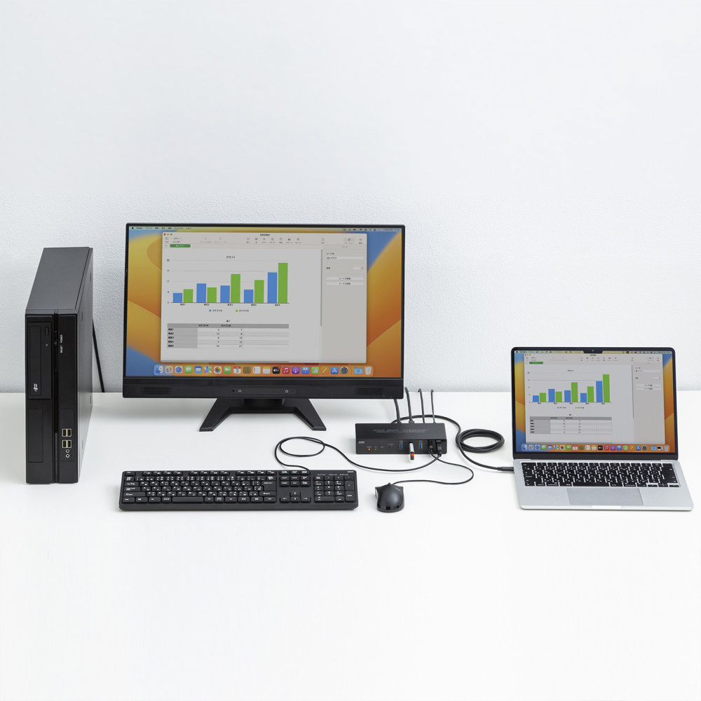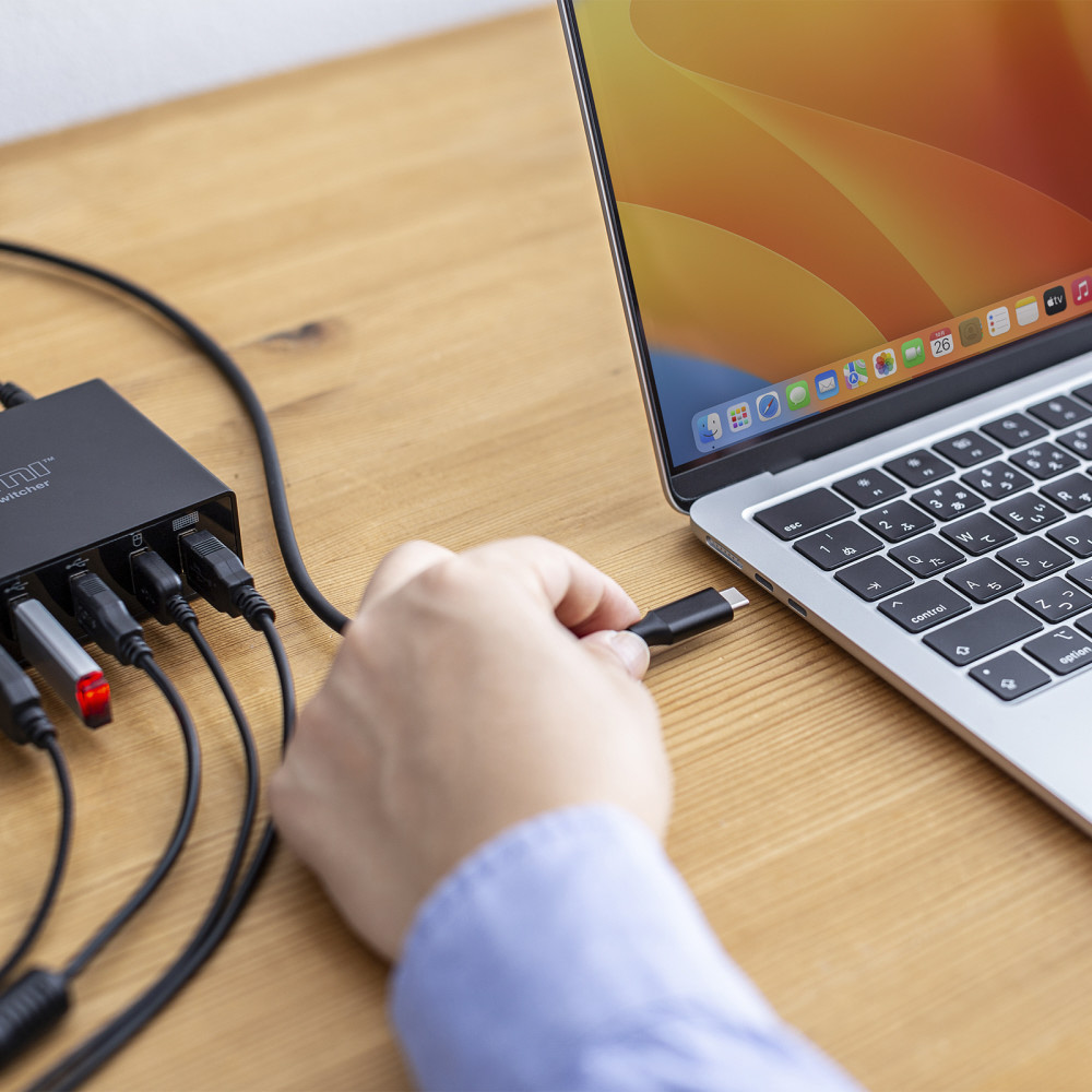 Type-C搭載ノートパソコンとHDMI出力のパソコンを切り替えて、一組のHDMIディスプレイ・USBキーボード/マウス・USBデバイスを切り替えて共有できるパソコン切替器。