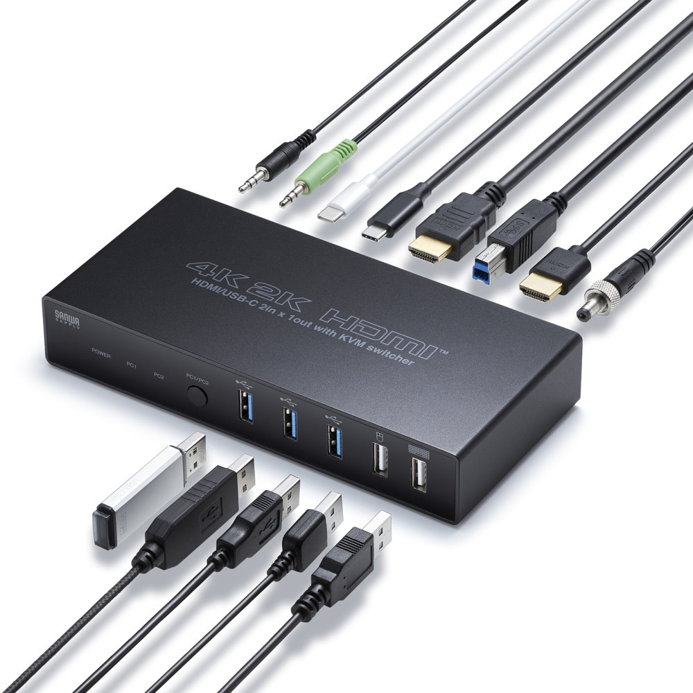 パソコン切替器 [USB-C・HDMIディスプレイ / USBキーボード・マウス / スピーカー・マイク対応] +USB-Aハブx3 SW-KVM2DK [2入力 /1出力 /4K対応 /手動]