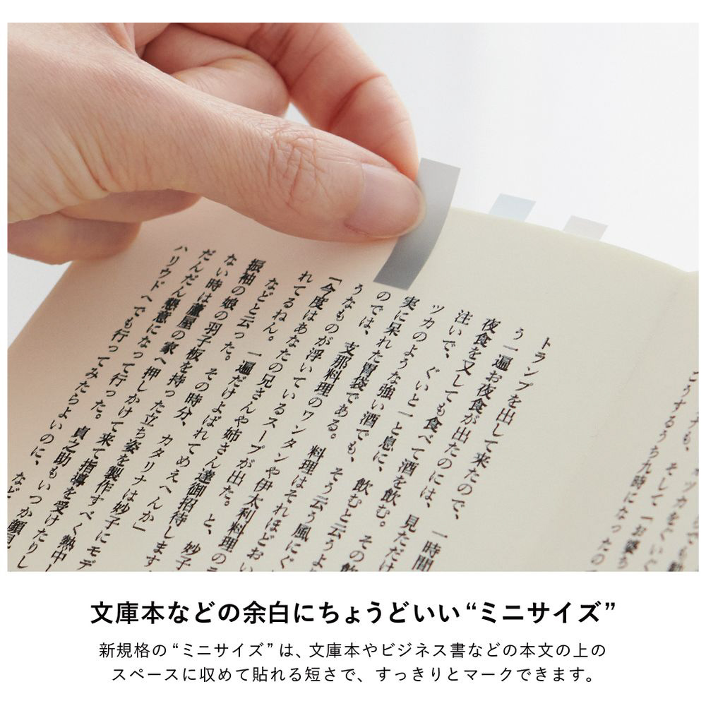 文庫本やビジネス書など、書籍類の本文の上のスペースに収めて貼れる短さ(24mm)で、