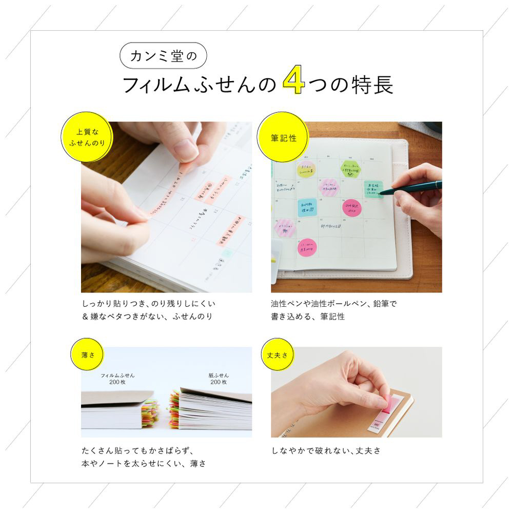ふせんは、紙よりも薄くて丈夫なフィルム製を採用。