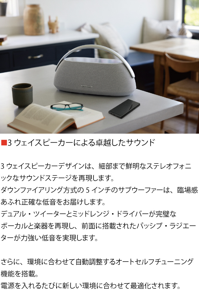 聴く場所を選ばず完璧なサウンドで音楽を楽しめます。Harman KardonGo + Play 3 は、電源を入れるたびに新しい環境に合わせて自動的にチューニングされ、設定場所に関係なく最高のサウンドを保証します。