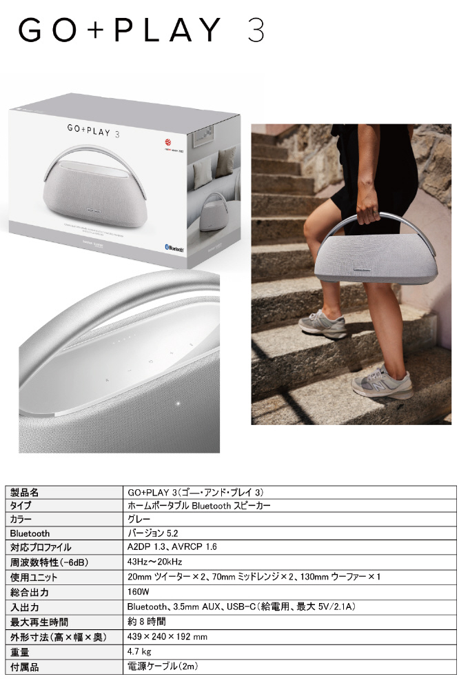 | 商品名 | ブルートゥーススピーカー GO+PLAY3 グレー HKGOPLAY3GRYJN [Bluetooth対応] |