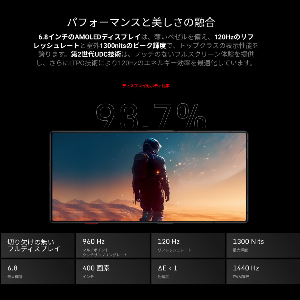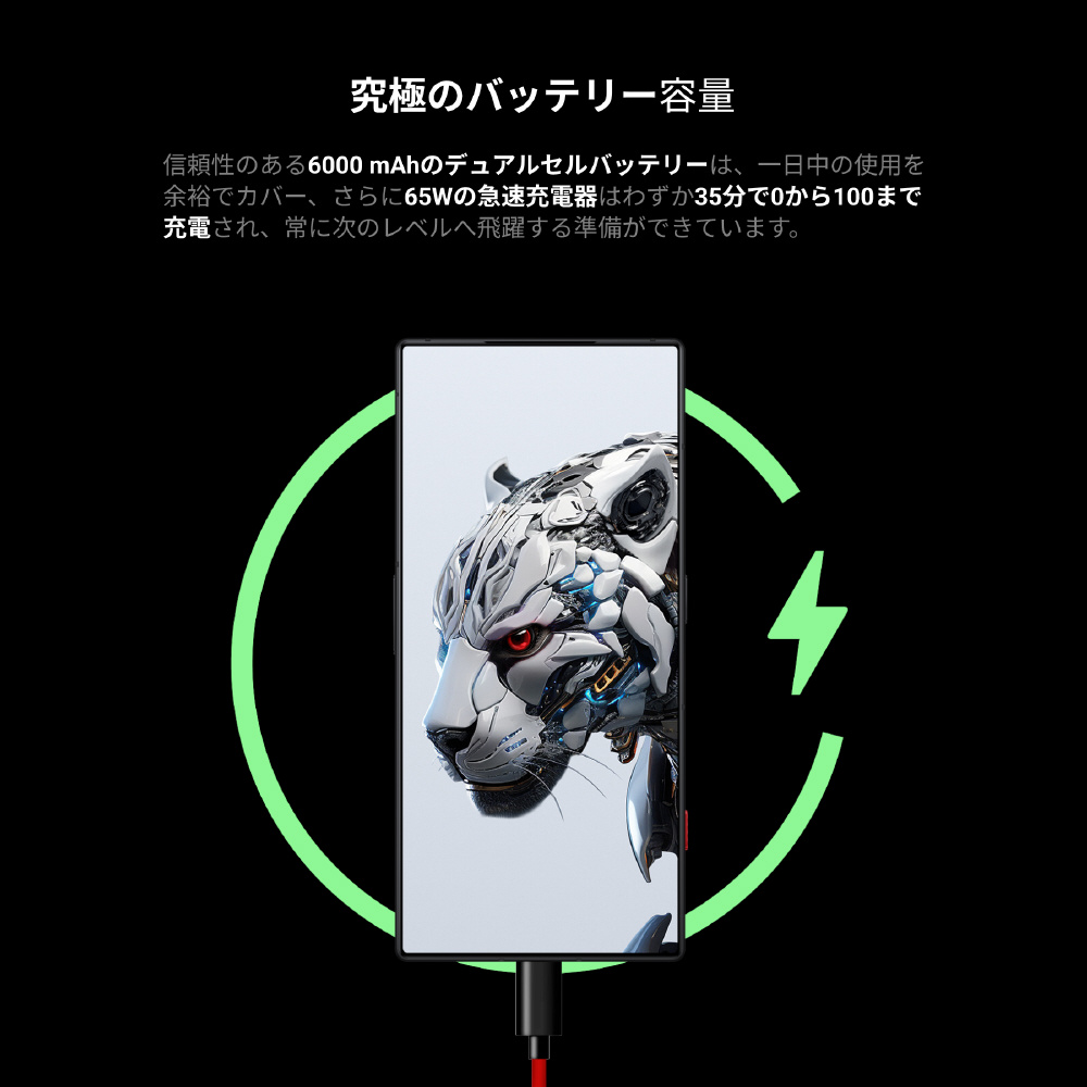完璧なゲーミング用スマートフォン、Snapdragon 8 Gen 2搭載。ICE 12.0冷却システムは高熱伝導ジェルで冷却、放熱速度を60%向上。6.8インチAMOLEDディスプレイ、120Hzリフレッシュレート、1300nitsピーク輝度。6000mAhデュアルセルバッテリー、65W急速充電。1216+1115Kスーパーリニアデュアルスピーカーでオーディオ体験の向上。トリプルカメラシステムは、お気に入りの瞬間をタイムレスな芸術品に変える精度と鮮明さを提供。REDMAGIC OS 8.0は、デバイスを細部までカスタマイズできる。