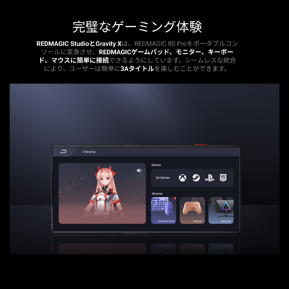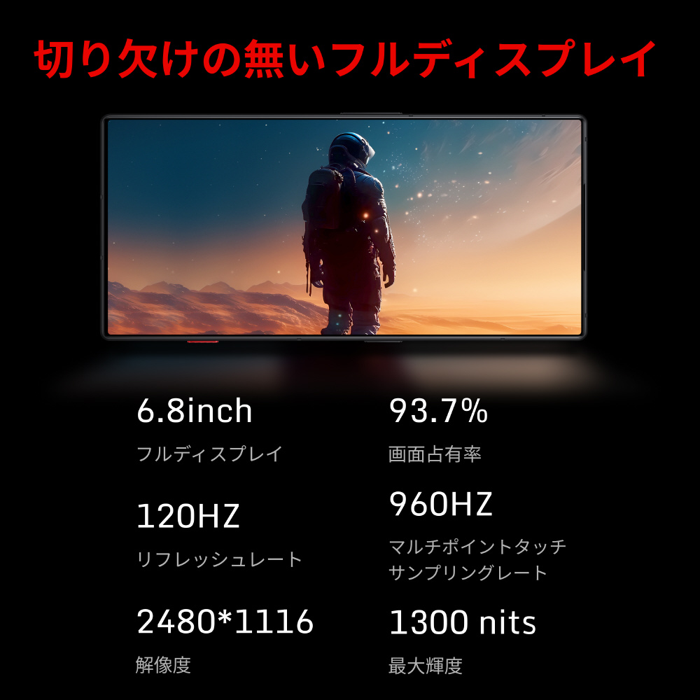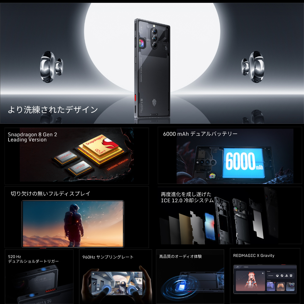 UDC技術で実現した切り欠けなしの全画面に、最新のSnapdragon 8 Gen 2リーディングバージョンと6000mAh大容量バッテリーが搭載され、さらに冷却ファン内蔵でパフォーマンスを限界まで絞り出せるREDMAGIC最新作スマホREDMAGIC 8Sシリーズ