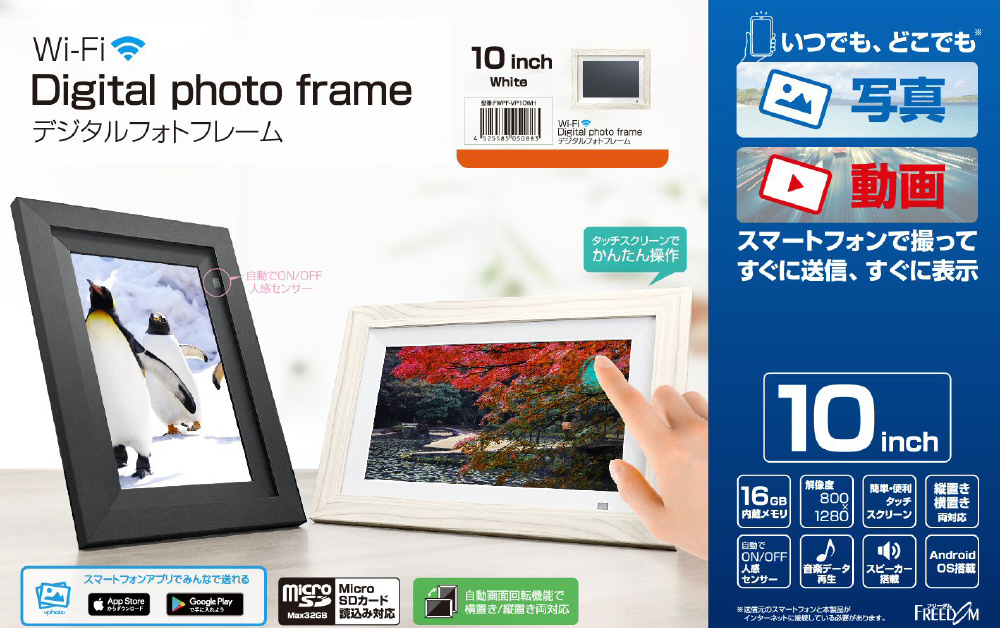 スマートフォンから写真や動画を受け取れるWi-Fi機能付デジタルフォトフレーム。