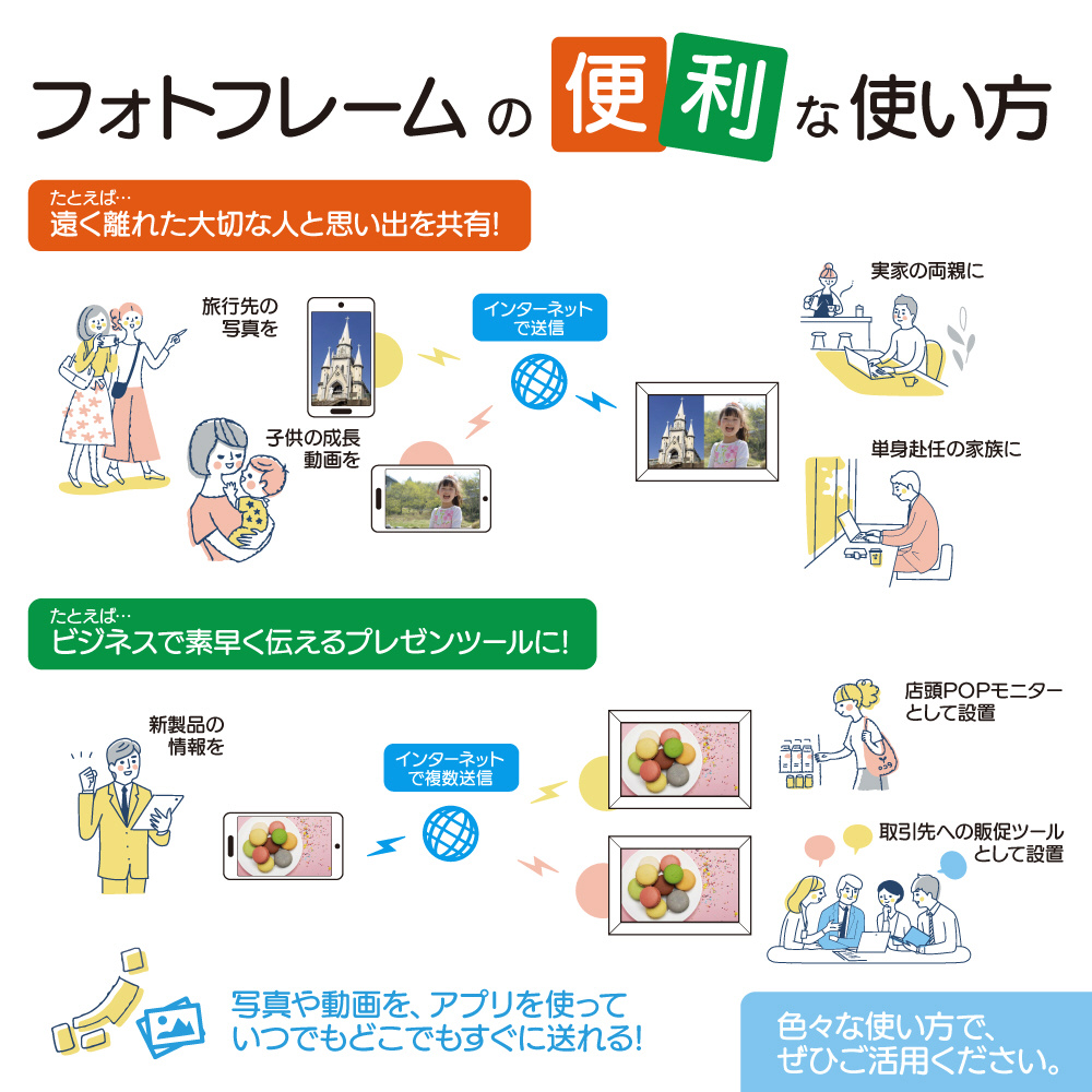 スマホのアプリを使って本製品へ写真や動画を送付することができ、行先や転居先で撮った画像を、離れた家族や友人とすぐに共有が可能です。