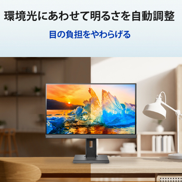 ディスプレイ本体に人感センサーを搭載。離席時には自動的にバックライトが暗くなるので、消費電力を削減できます。席に戻ってくると、画面は自動的に点灯します。 - 周囲に合わせて画面の明るさを調整