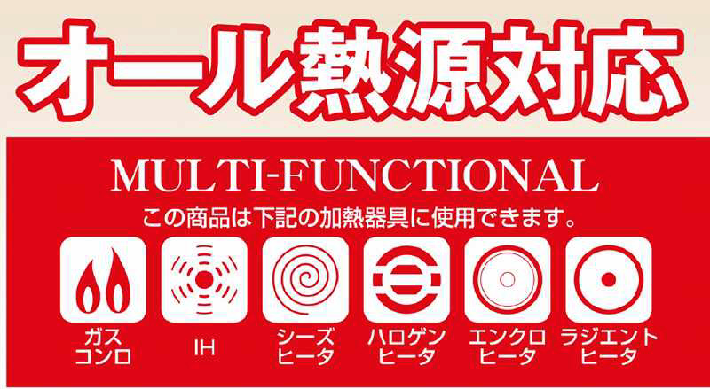 ガス火はもちろん、IHクッキングヒーターやハロゲンヒーターなどオール熱源に対応。