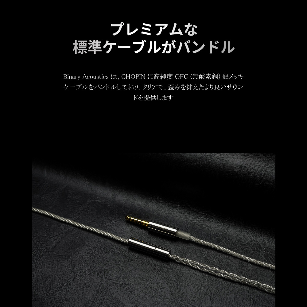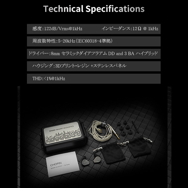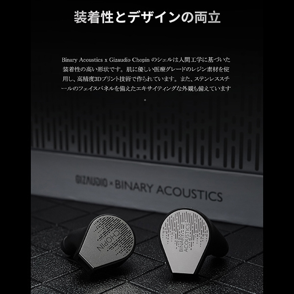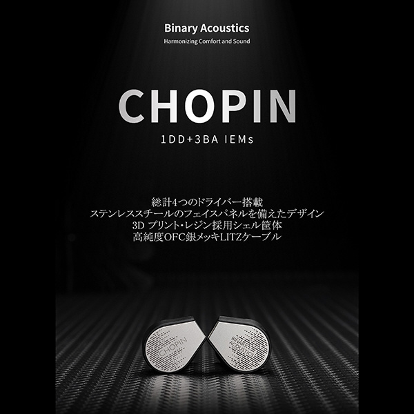 BAドライバーモデルを中心に生産を開始した中国の新興ブランド、Binary Acousticsと人気レビュアーであるGIZAUDIOとのコラボ製品としてこのCHOPINが3BA+1DDのハイブリッド構成でリリースされます。