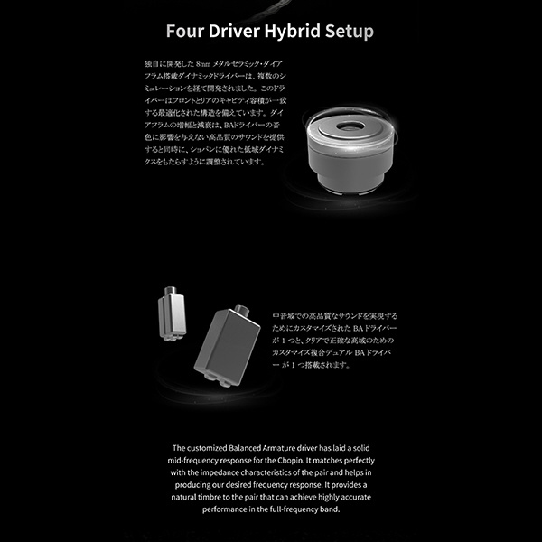 DRIVER: 3BA+1DD(8mm セラミック/メタル複合・ダイアフラム搭載)