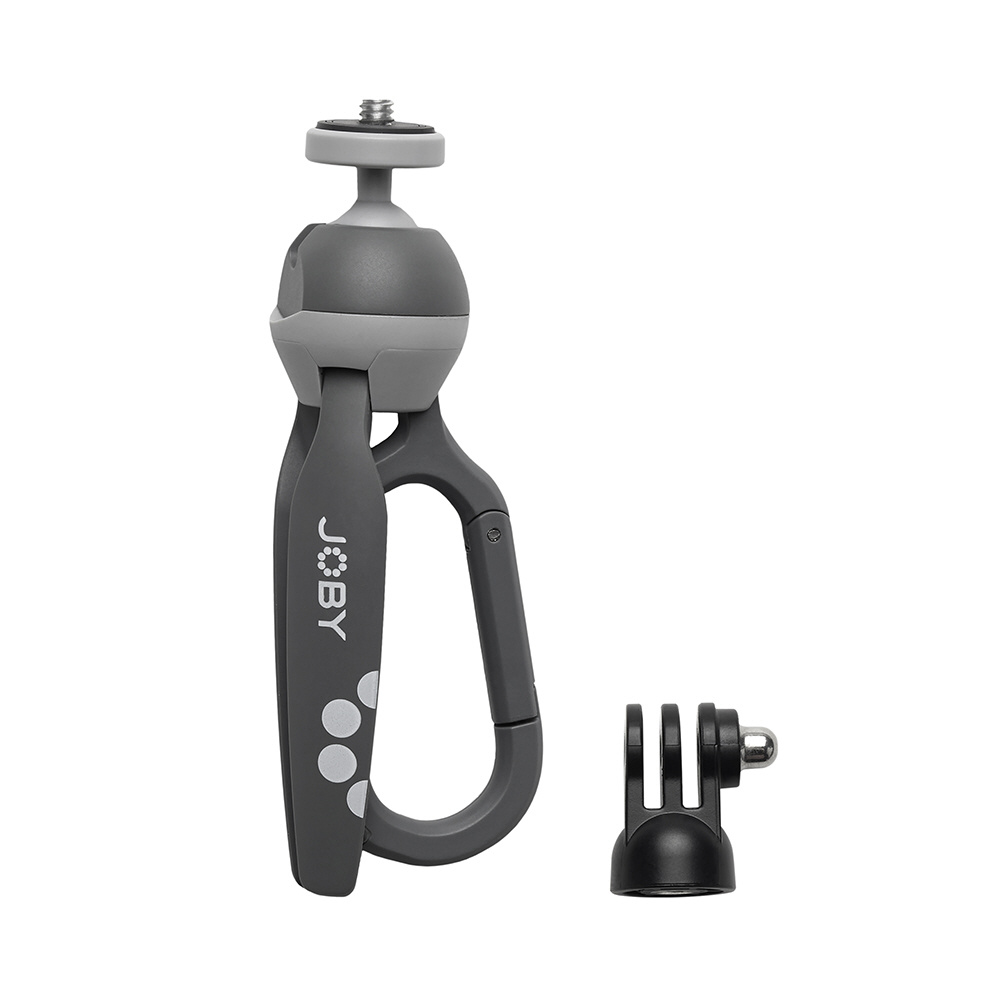 <仕様>外寸:4.5 x 3.2 x 15.2 cm / 自重:0.06kg / 耐荷重:0.5kg / アタッチメント:1/4オスねじ / 材質:アルミニウム、スチール、ガラス繊維強化ナイロン、TPE / カラー:グレー / 付属品:ピンジョイントマウント(アクションカメラ用アダプター)