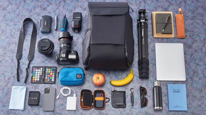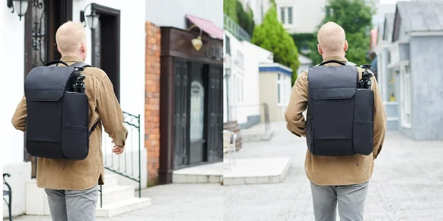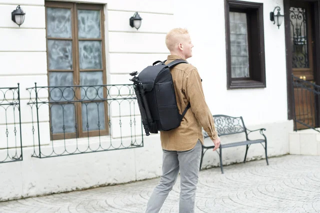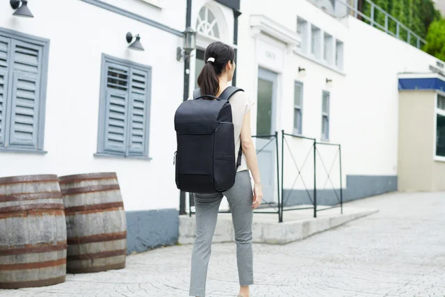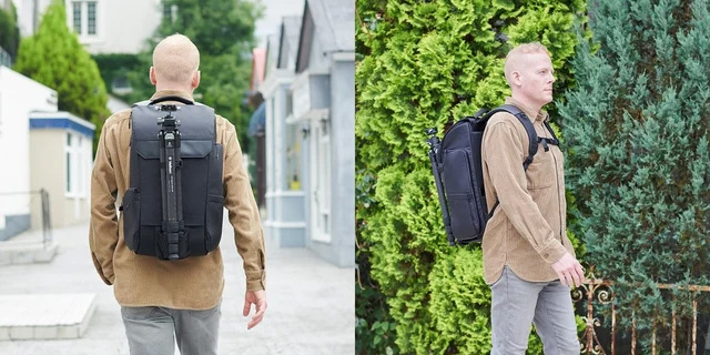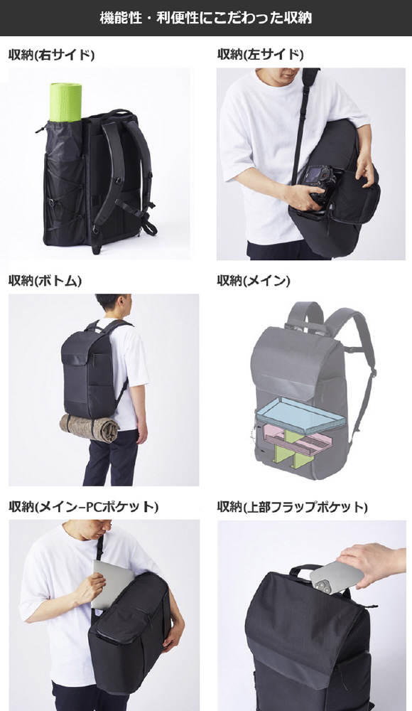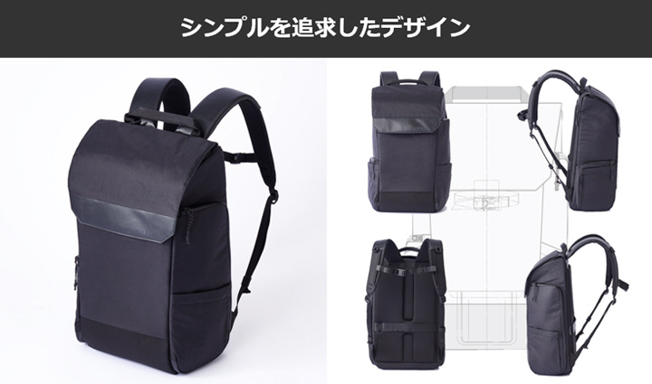 日常使いができるちょうどよいサイズ。タウンユース、アウトドア等様々なシーンでの使用を想定し、ベーシックなカラーを選定。余計なものは表に出さないシンプルですっきりとした外観を目指し、三脚収納用のストラップやポケットは使用時にのみ取り出せるよう設計しました。