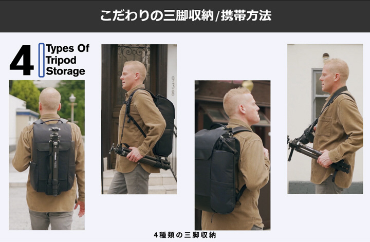 老舗三脚メーカーが考える、三脚収納/携帯にこだわったバッグ。4タイプの収納/携帯方法を実現。お手持ちの三脚サイズや他の収納物とのバランスを考え、収納・携帯方法をチョイスできます。