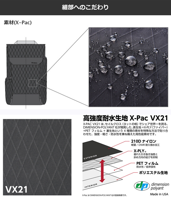 メイン素材に使用している「X-Pac」は、セイルクロス(ヨットの帆)で世界一のシェアを誇るDIMENSION-POLYAN社が開発した、表生地+X-PLY(ファイバー)+裏生地という複数の素材を特殊な方法で貼り合わせたもので、強度・軽量性・防水性を兼ね備えた世界的に注目されている高性能素材です。