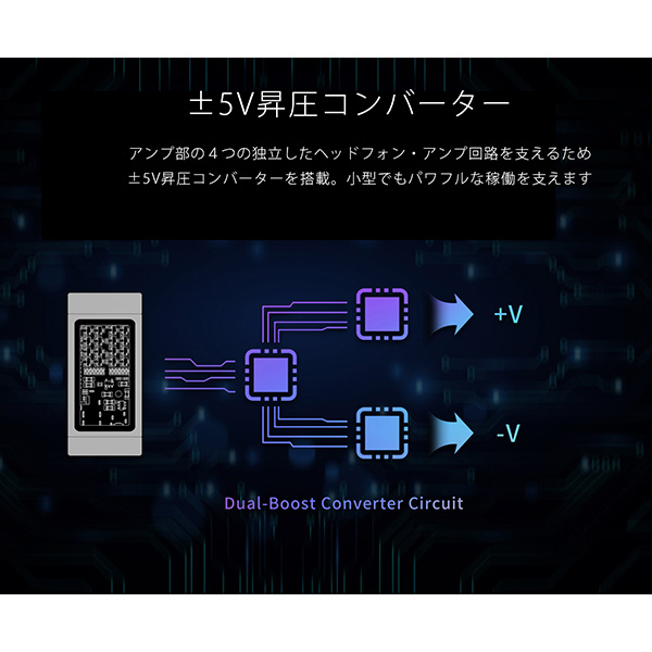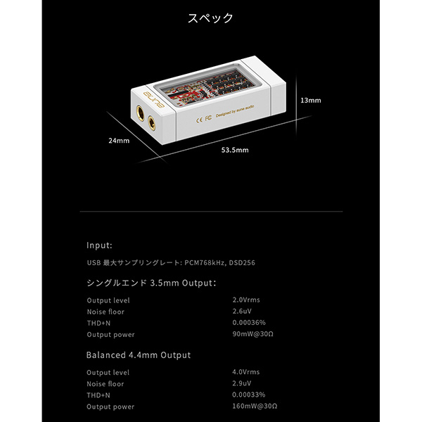 アンプ部はフルディスクリート回路。DAC部とアンプ部を分離したセラミックPCB搭載。徹底しています。また本体に窓を設けることで回路を見る事ができるデザイン。4インディペンデント・アンプを±5Vで稼働させます。