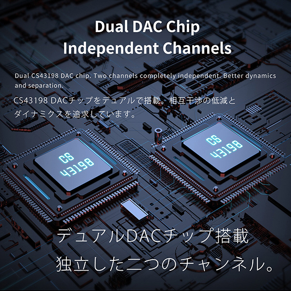 デュアルDAC搭載 (CS43198 ×2)L/Rセパレート構造。PCM 32bit/768k DSD256 サンプリング・レート対応