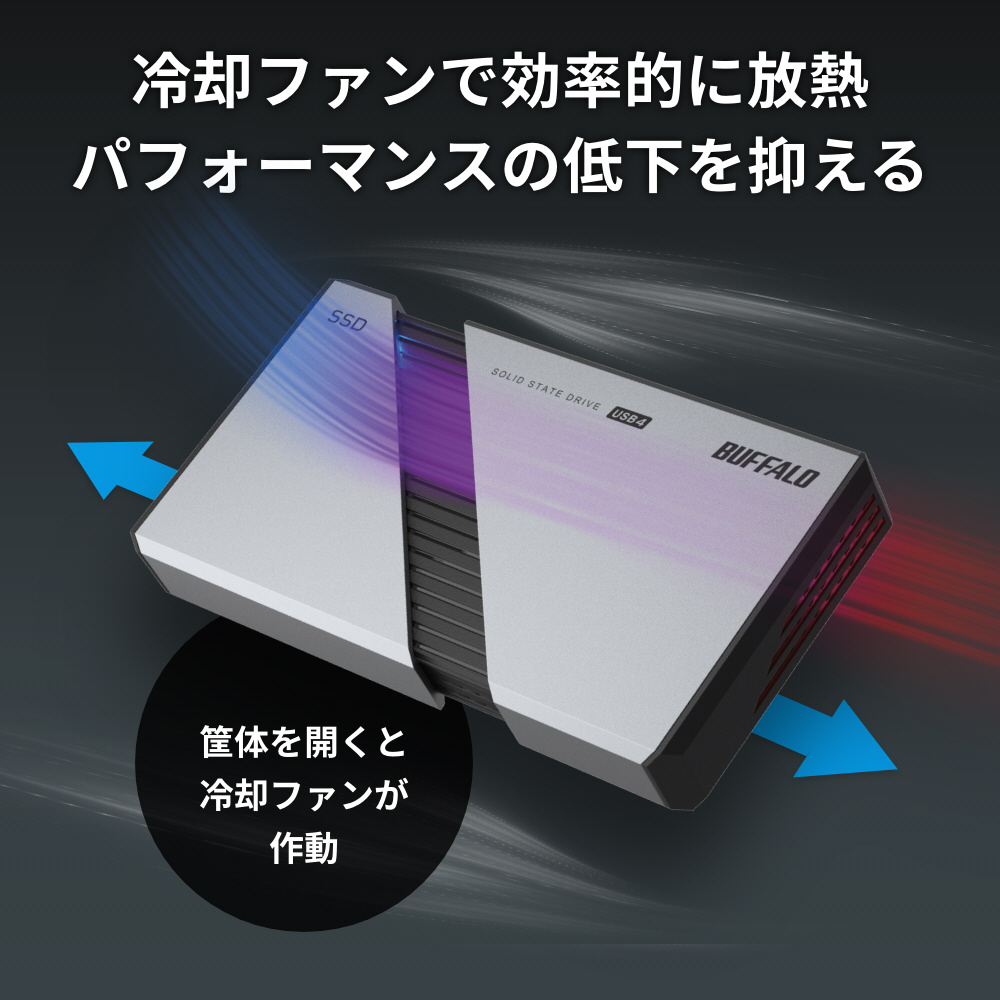 SSDは稼働し続けることでコントローラーが発熱し、高温になるとパフォーマンスが低下することがあります。本商品は使用時に筐体ケースを開くことで冷却ファンが作動、筐体内部の温度を下げパフォーマンス低下を抑えます。