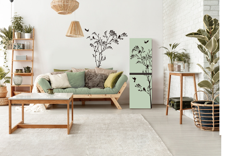 木と小鳥のデザインで、冷蔵庫を簡単にきせかえできます。