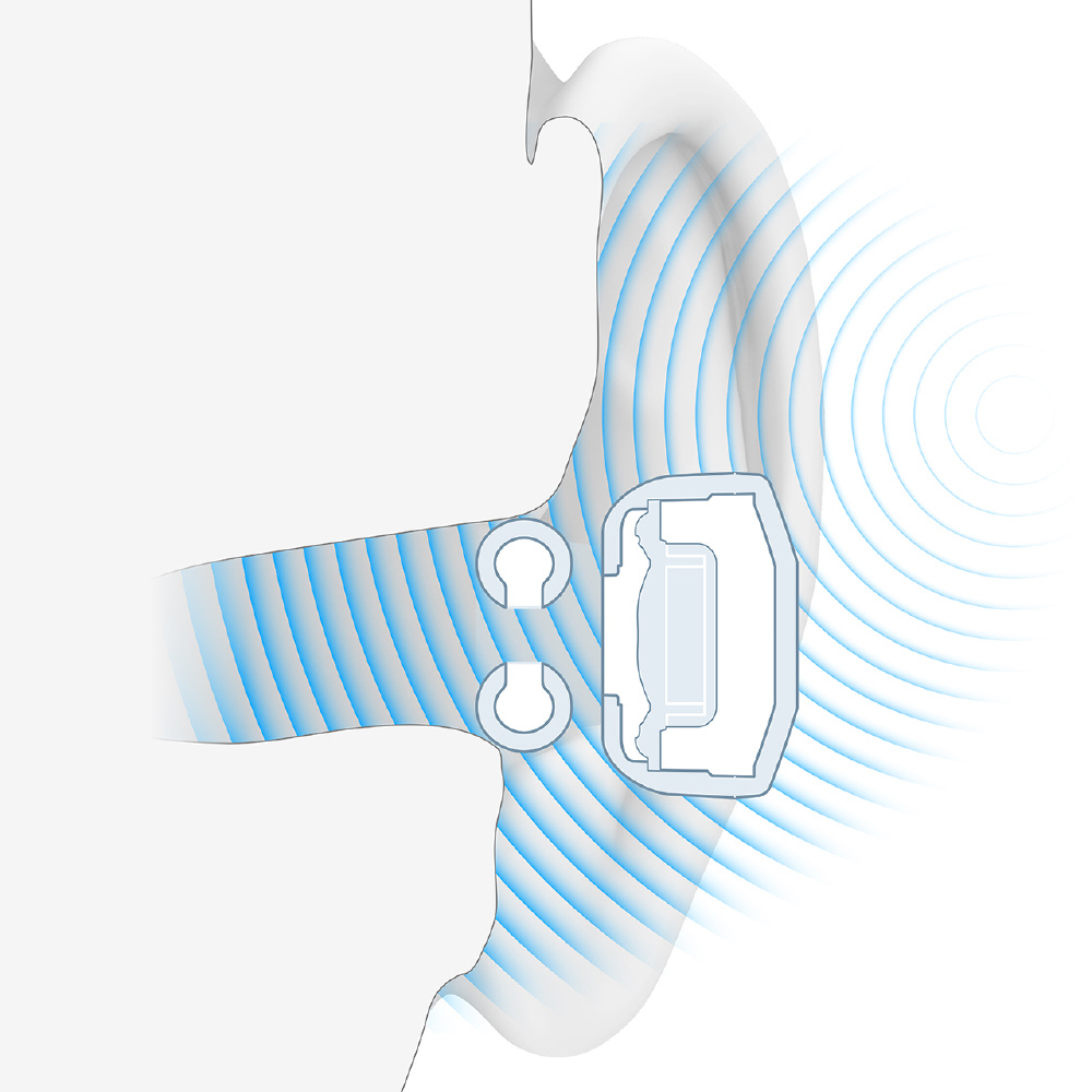 フローティングフィットシステムは、筐体から伸びるリング形状のイヤーピースが耳甲介にぴったりと収まり、耳の大きさや形状に関係なく、耳から浮遊したドライバーユニットを内蔵する筐体を理想的な位置に保持します。