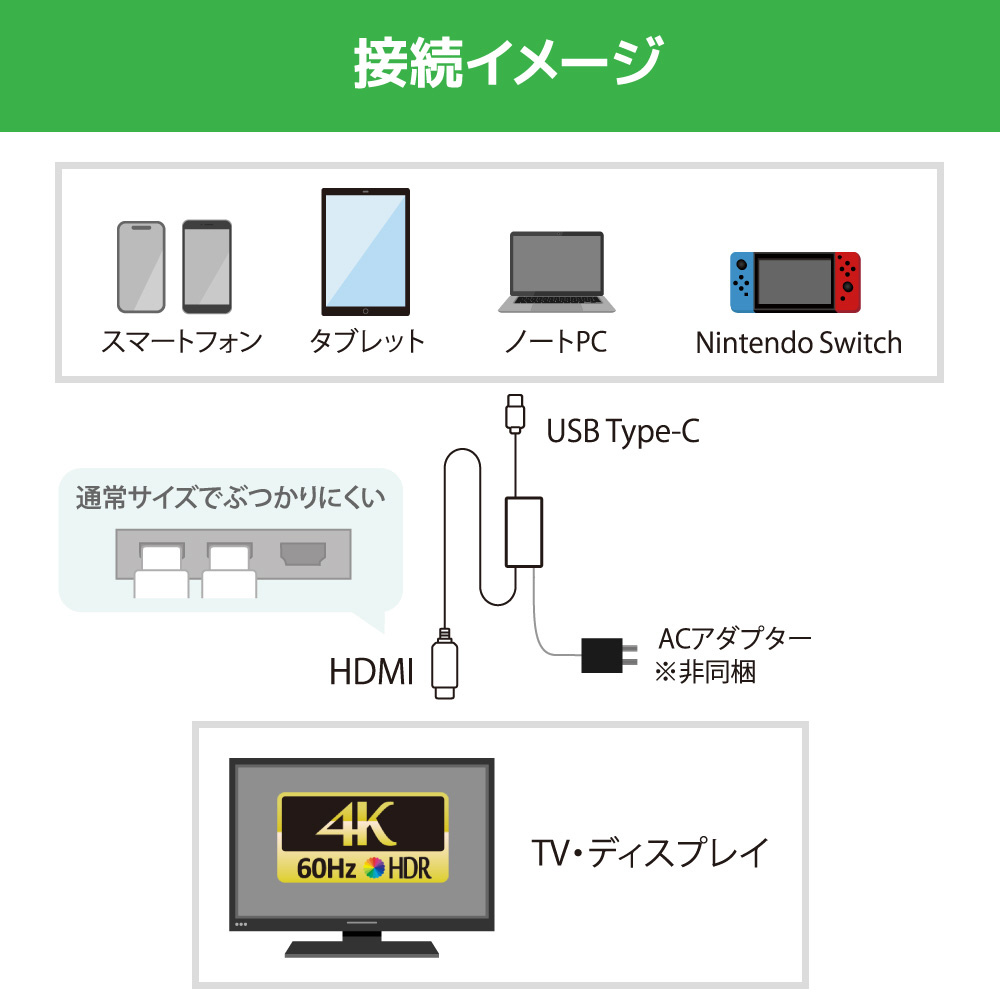 本製品は、Type-Cポート搭載のスマートフォンやタブレット等の映像をHDMI入力端子搭載のテレビやディスプレイに出力可能なUSB Type-C to HDMI変換ケーブルです。