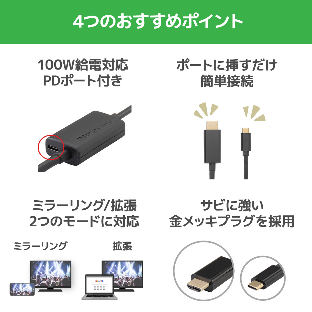 スマホ、タブレット、ノートPCなどを充電しながら大画面で観る!100W対応のPDポートを搭載、4K60Hz、HDR対応のUSB Type-C to HDMI 変換ケーブル