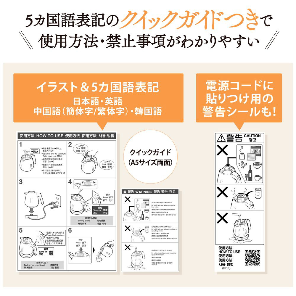 象印の0.8L電気ケトルは、600Wの消費電力で、安全設計と使いやすさを両立。