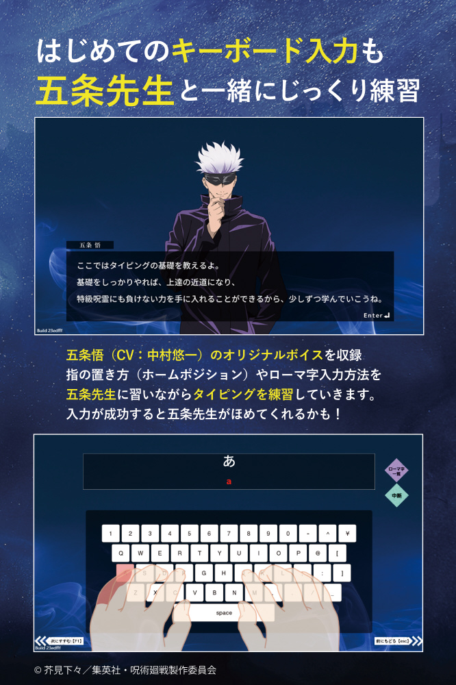 呪術廻戦タイピング「術打」は、子どもから大人までタイピングゲームを楽しみながら、ブラインドタッチなどスキルアップを目指したタイピング練習ソフトです。