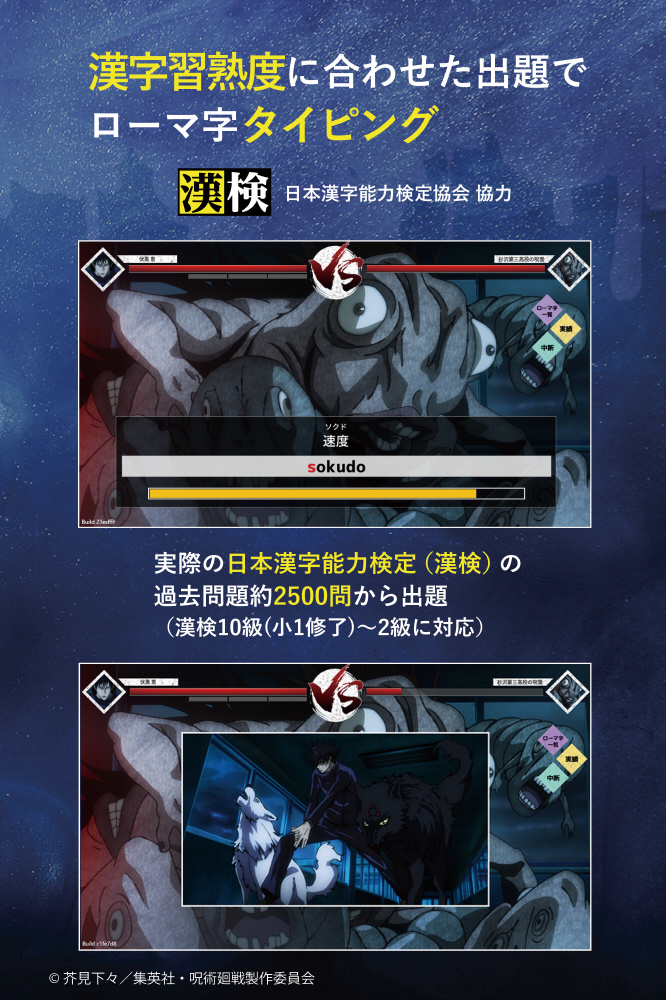 ■タイピングを極めて目指せ最強の「術打師」アニメ「呪術廻戦」のキャラクターとともにタイピングゲームで呪霊を祓おう。