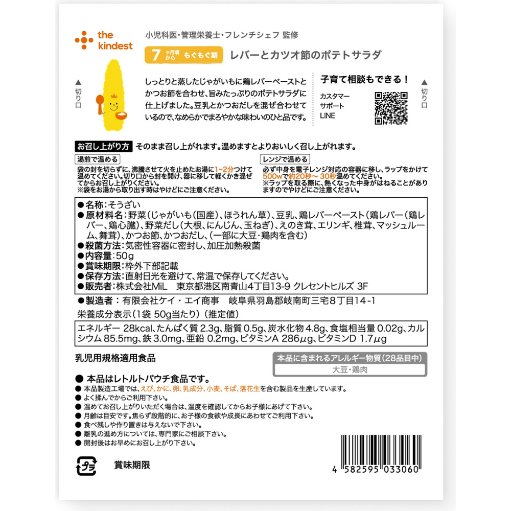| 商品名 | the kindest(カインデスト)レバーとカツオ節のポテトサラダ 50g〔対象月齢7か月〜〕 |