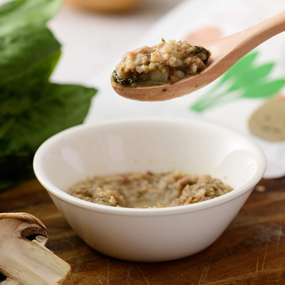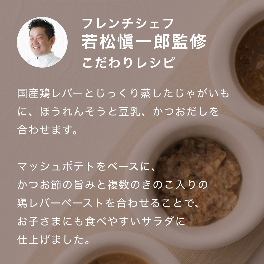 当商品は、お子さまに人気のマッシュポテトサラダをベースに、かつお節の旨みと複数のきのこ入りのレバーペーストを合わせることで、食べやすく仕上げました。