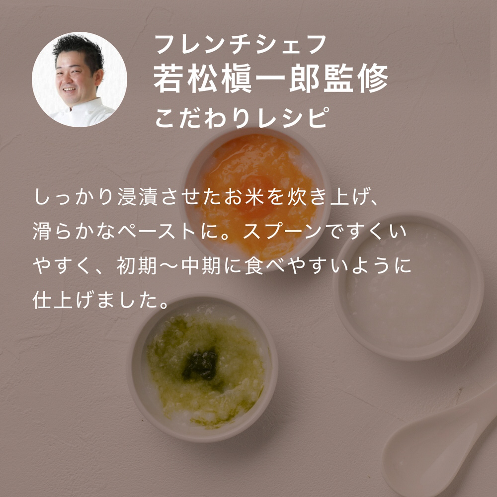 おこめ本来の香りと甘みがいきた、さらりとした品種を厳選することで、離乳食初期のメインおかゆとして満足いただける味わいを目指しました。