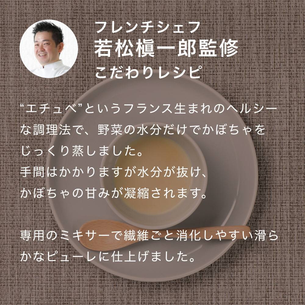 かぼちゃの素材の味を生かして、シンプルなピューレにしました。かぼちゃの甘みとおいしさを引き出すため、かぼちゃを丸ごとじっくり焼いてからピューレにしています。