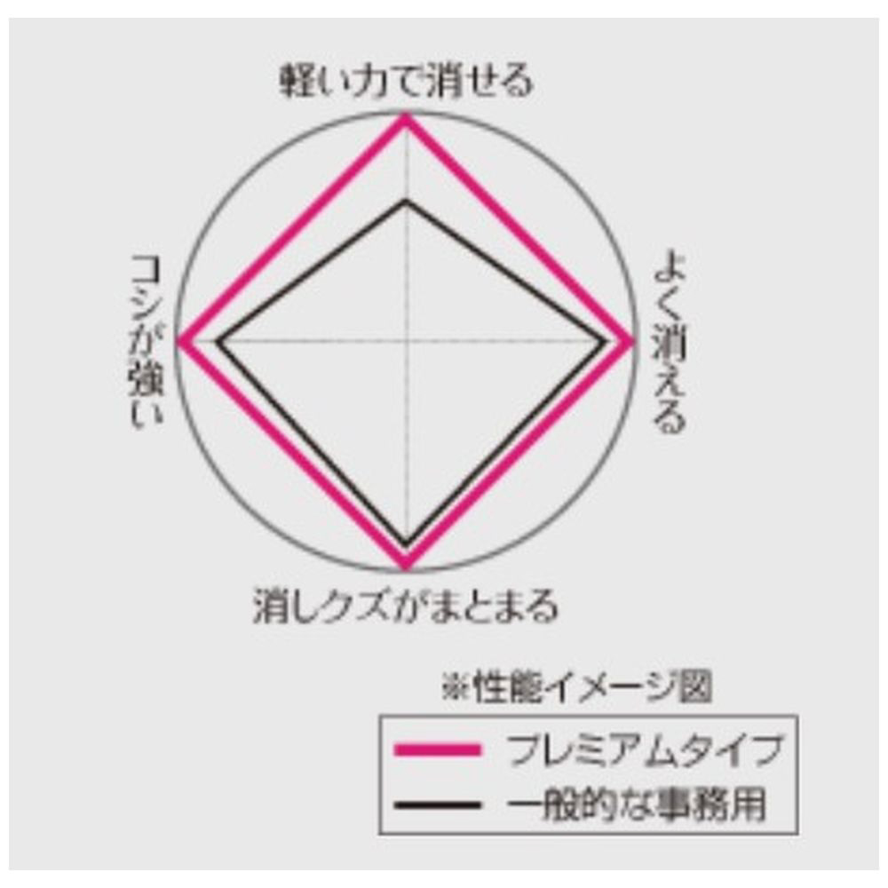 特殊発泡体とイレースポリマーのツイン構造による特殊製法で、「高いレベルの消字性」と「軽い力でサラッと消せる」と「消しクズがまとまる」を実現。消しゴムにコシがあるので、折れにくく細かいところを消すのに適しています。