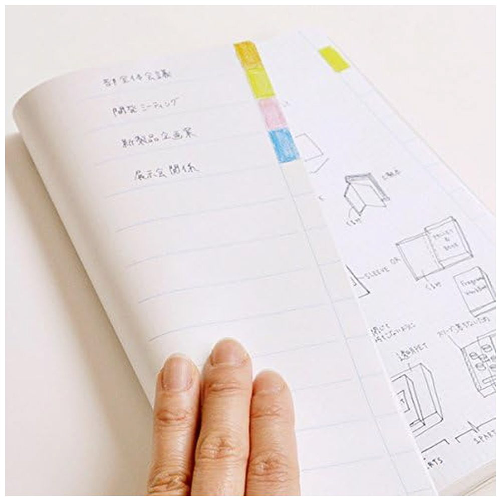 ページ番号と見出しインデックスで、書いたコトがたどりやすいノートです。ノートにはページ番号がふってあり、インデックスを内容毎に色分けしたり、ページ番号をメモしておくと、記録をどこに書いたかカンタンに見つけ出す事が出来ます。