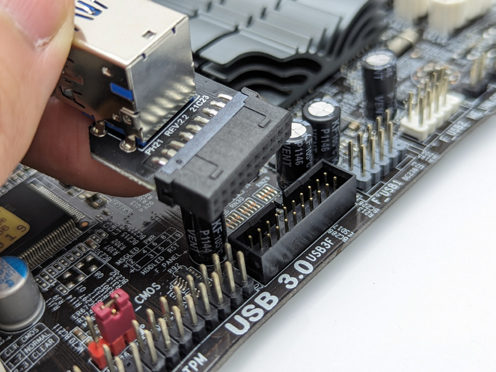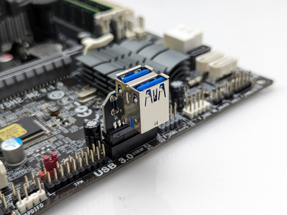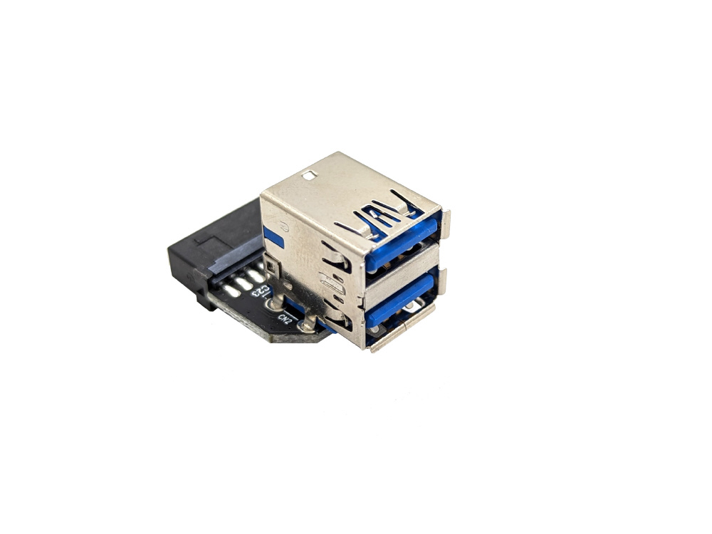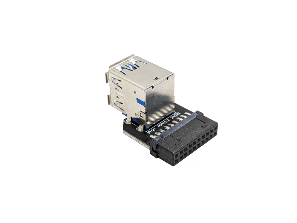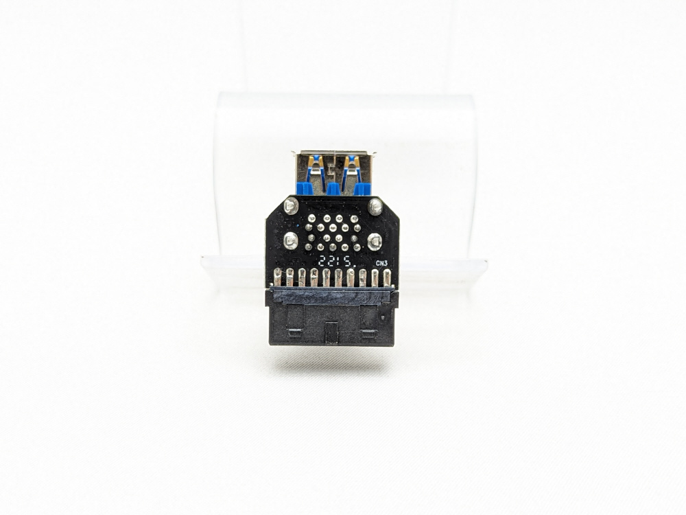 マザーボード上のUSB3.0/19ピンコネクタをUSB3.0ポートへ変換するアダプタです。ポートが基盤に対して縦に並んでいます。