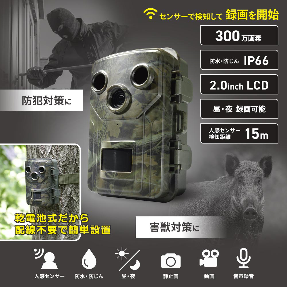 人感センサー機能付きで、人や動物を検知すると自動で録画を開始します。防犯対策・害獣対策に。