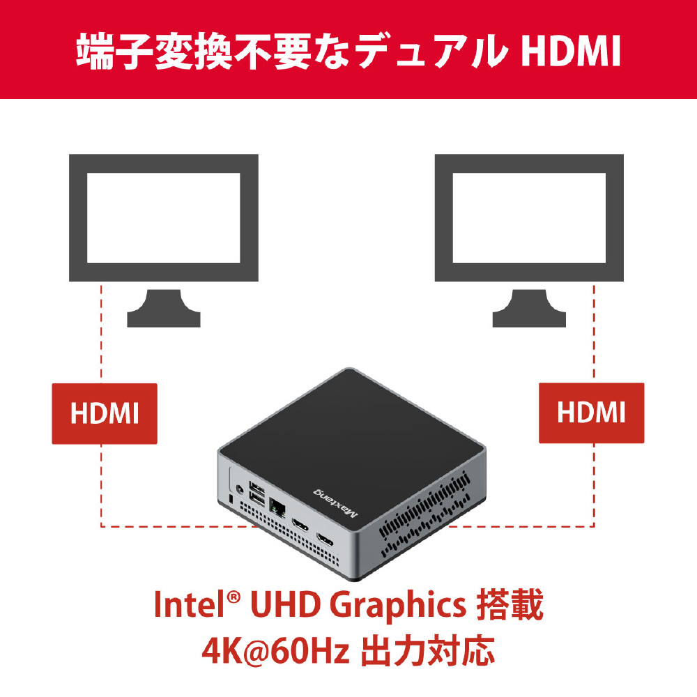 Maxtang MUC-5095は、4コア/4スレッドの高性能なIntel Celeron Processor N5095を搭載した超小型デスクトップパソコンです。わずか129mm四方の超小型筐体でVESA規格に対応し、デジタルサイネージや組み込みなど設置場所に制約のある用途に最適です。HDMIを2ポート搭載し、4K@60Hz表示とデュアルディスプレイに対応します。