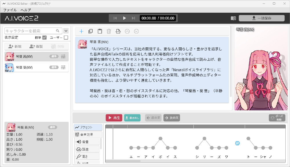 「A.I.VOICE2 琴葉 茜・葵」は関西弁の姉「茜」と、標準語の妹「葵」の双子の姉妹の声が使用できる音声合成ソフトです。