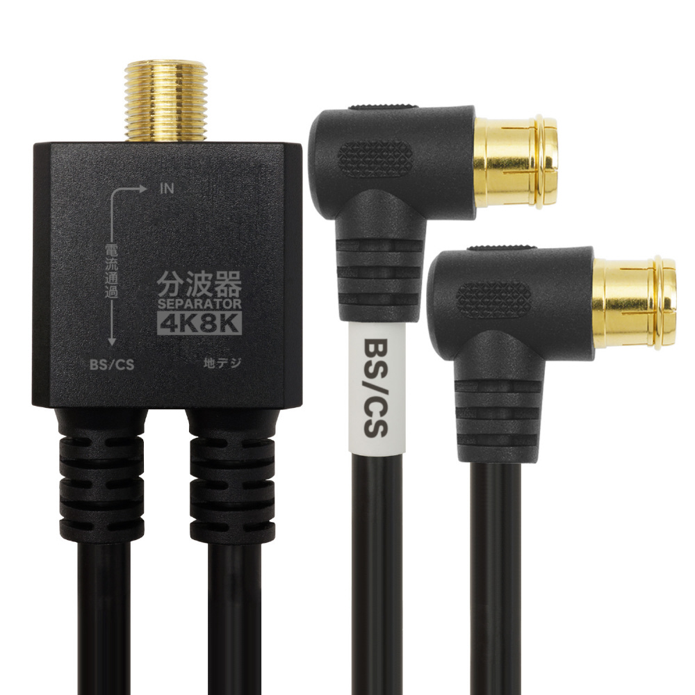 ■地デジ放送、BS/CS放送をそれぞれ視聴したいときはコレ! 地デジ(UHF)と衛星波(BS/CS)を効率よく分け、1台のテレビで地デジ、BS、CSを視聴できます。 ■4K/8K衛星放送対応 従来の地デジ、BS、CS放送に加えて、最新の4K/8K放送にも対応しています。 ■ケーブル一体型構造 分波器本体と出力側ケーブルが一体型のつくりになっているため、分離型に比べて接続損失を軽減することが可能です。 ■便利なL字差込式コネクタ 狭い隙間での接続にはもちろん、テレビのアンテナ端子位置によっては、配線の露出を防ぐことができ非常に便利です。