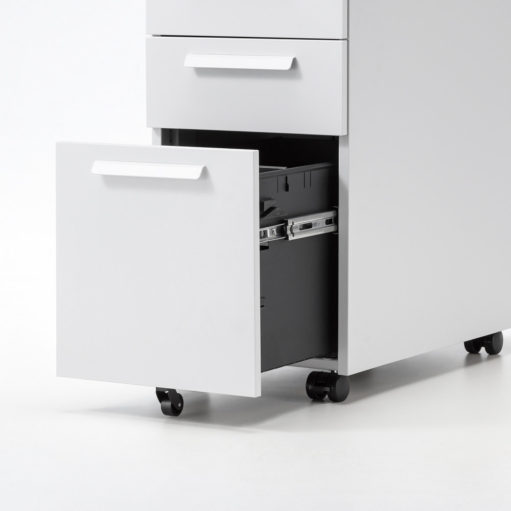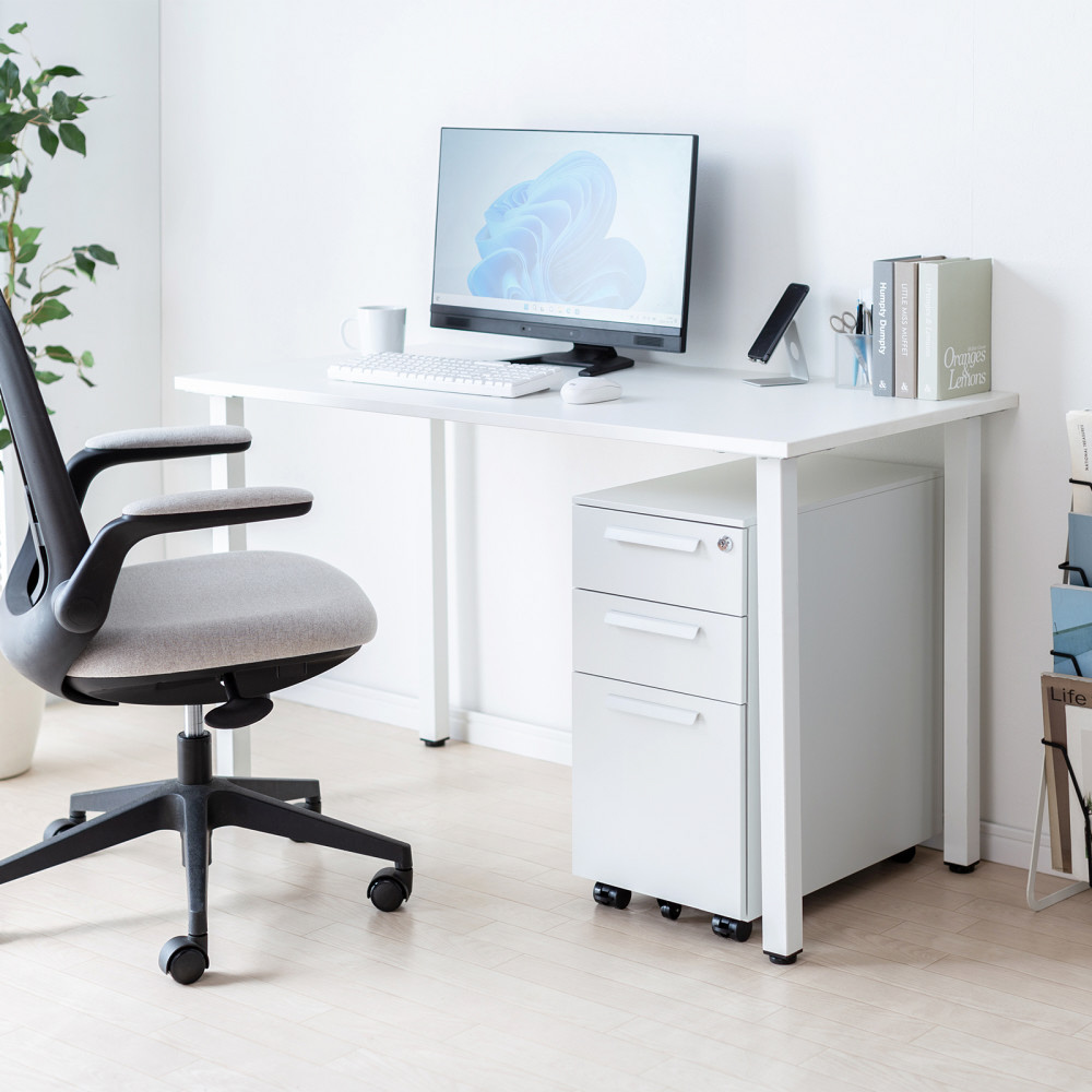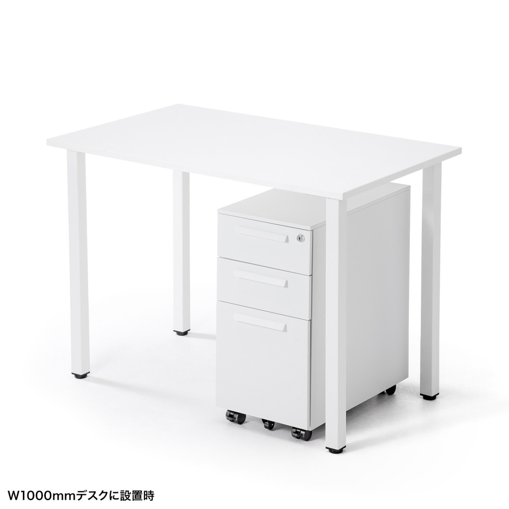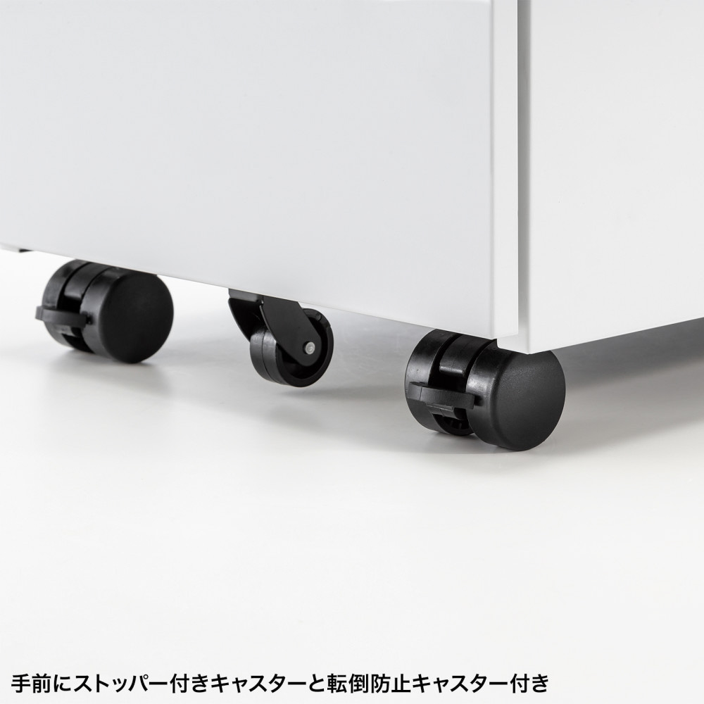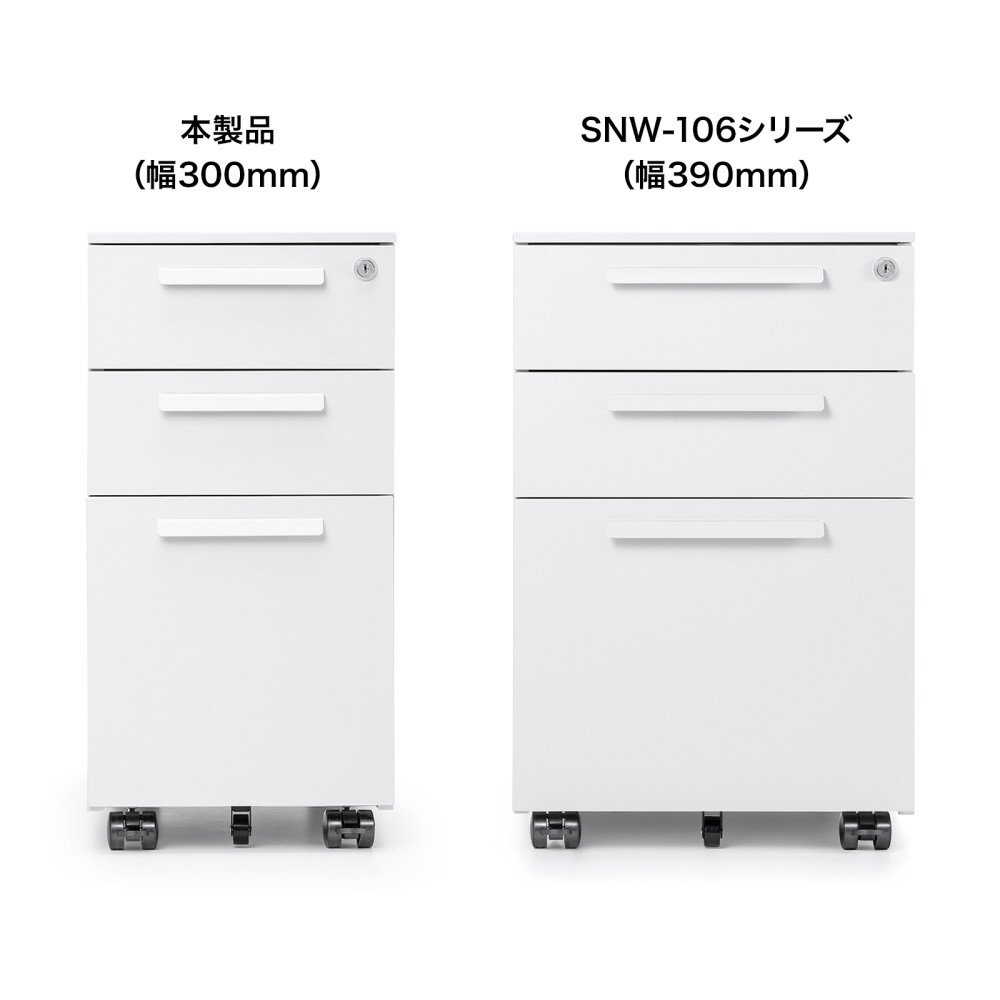 幅の狭いデスクで使いやすい、W300mmのスリムな3段タイプ。高さ600mm・奥行き534mm。ホワイト。