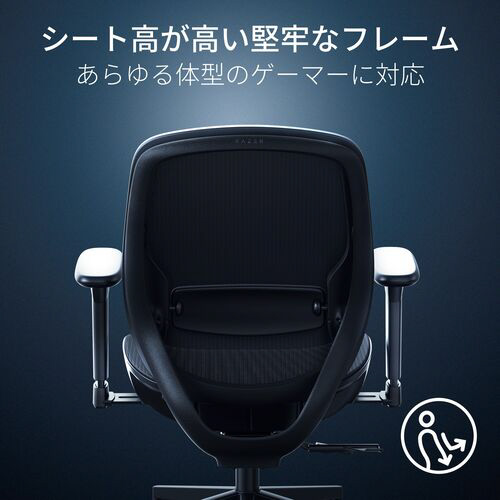 Razer 初の、超耐久性と通気性に優れたメッシュ素材を採用したゲーミングチェア、Razer Fujin で長時間のゲームプレイでもクールに過ごせます。長時間のゲームプレイでも最適なエアフローと快適さを提供するために設計され、シンクロチルト技術、3D アームレストなどにより無重力の座り心地を実現します。