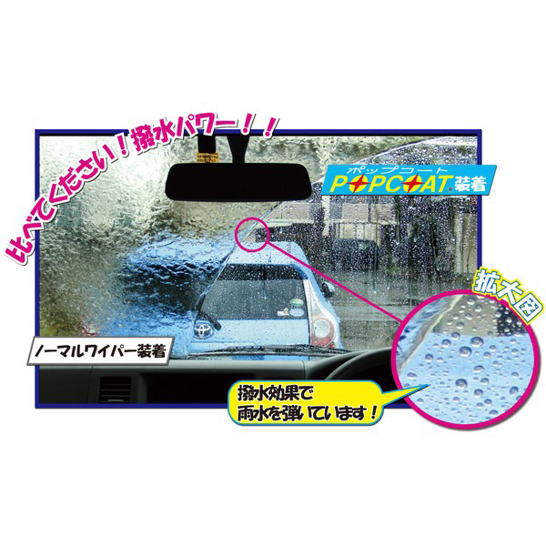雨がはじけ飛ぶ爽快感!ポップコート替えゴムガラス面に水またはウォッシャー液をかけながらパワー・オン!およそ60秒で撥水被膜が完成。ワイパーが気持ち良く水を弾きます。