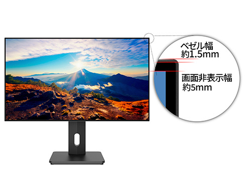 ■4辺フレームレスデザインを採用。浮かび上がるようにコンテンツを鮮やかに映し出します。4辺狭額縁パネルによる省スペース設計を行い、置く場所にも困らない使いやすいサイズを実現しました。また複数並べて使用するマルチディスプレイ構成にも最適です。
