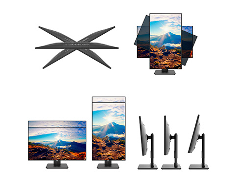 最大130mmの範囲で高さ調整が可能な、昇降式スタンドを採用。お好みの高さにモニターをセット出来ます。ピボット機能で90度回転、縦での使用ができます。また水平方向のスイーベル(左右各30度)、上下の角度調整チルト(-5度〜+15度)も可能です。