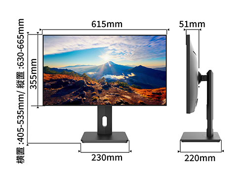 | 本体サイズ | 高さ:横405-535mm 縦630-665mm 幅615mmx奥行220mm スタンド幅230mm(スタンド付) 高355mmx横615mmx奥行51mm(スタンド無し) |