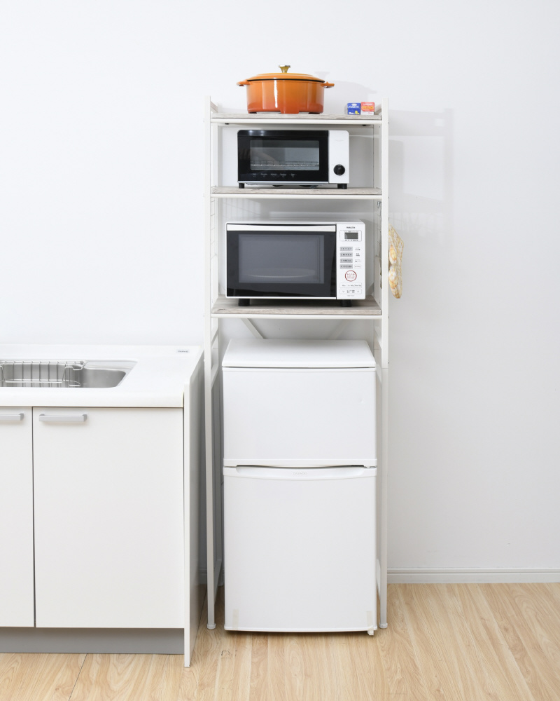 小型冷蔵庫やゴミ箱上のスペースを有効活用できる収納ラック。